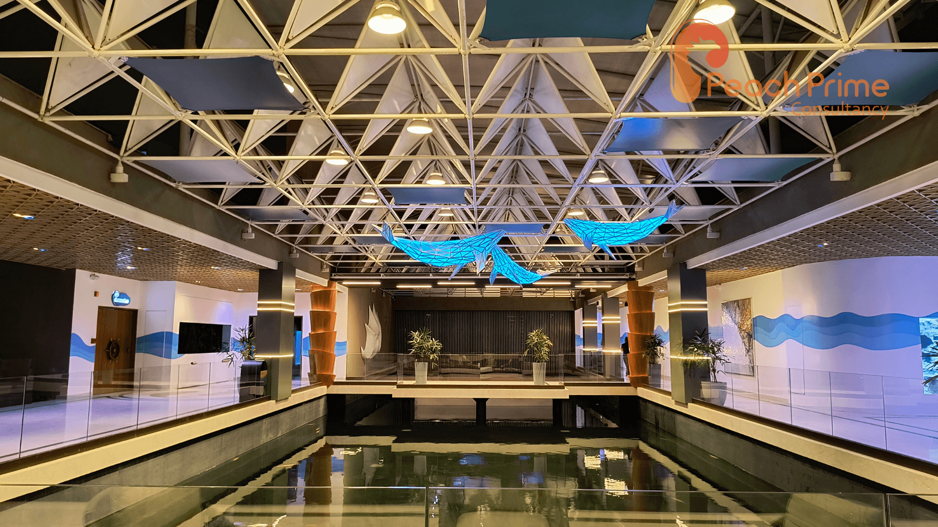 The Polygonal Fish Hanging Sculpture by Peach Prime Consultancy redefines traditional artistic expressions by integrating bespoke lighting installations with sleek, contemporary design. The sculpture features striking geometric forms that portray marine life in a captivating and dynamic way. The careful combination of architectural lighting solutions elevates the overall visual experience, blending art and technology seamlessly. This artwork highlights the designer lighting fixtures that create unique lighting effects, enhancing the sculpture’s beauty, and ensuring that it draws attention from all perspectives, making it an awe-inspiring installation.